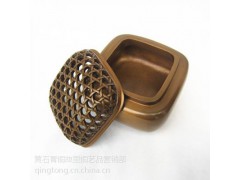 名称:精铜藤编纹四方薰炉(底部落款:张鸣岐)