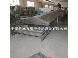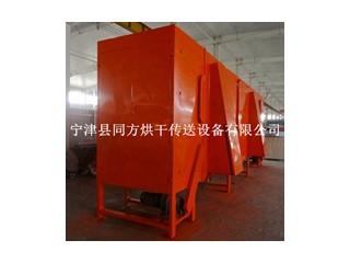 物料由加料器均匀地铺在输送带上,由传动装置拖动在干燥机内移动。干燥机由若干单元组成,每一单元热风独立循环,其中部分尾气由专门排湿风机排出,每一单元排出废气时均有调节阀控制。热气由上往下或由下往上穿过铺满物料的网带完成热量与质量传递的进程,带走物料水分。网带缓慢移动,运行速度可根据物料温度自由调节,干燥后的成品连续落入收料器中。
