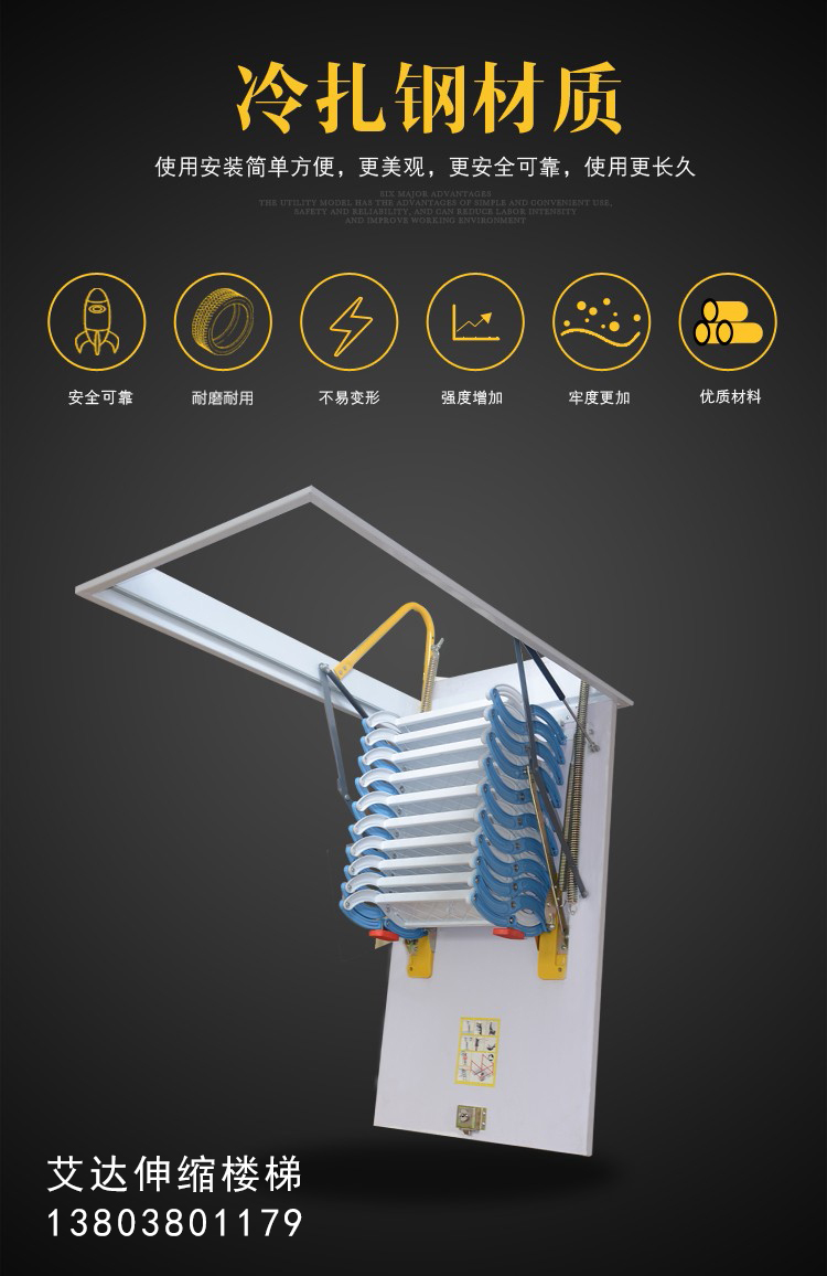 阁楼伸缩楼梯适合空间小的阁楼使用,不用的时候可以收起来,门板盖上,不影响下面的空间利用。非常节约空间。